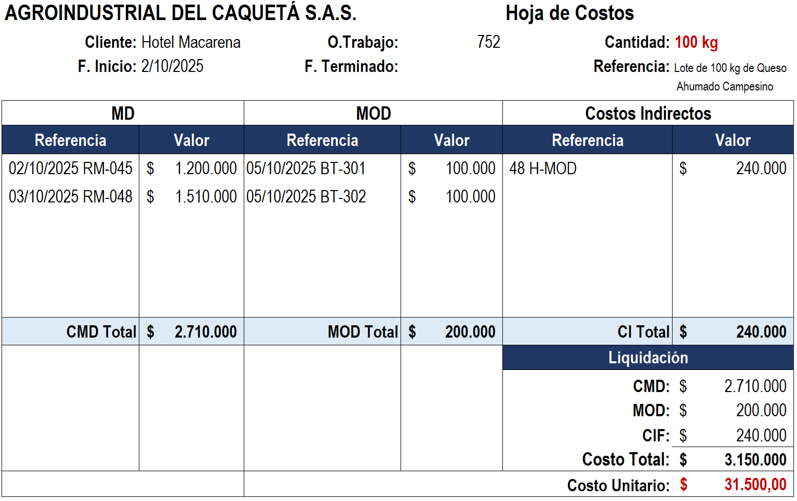 Una vez que el departamento de producción finaliza todos los procesos para una orden y se le da el visto bueno de calidad, la Hoja de Costos se totaliza y se cierra. En nuestro ejemplo de “Agroindustrial del Caquetá S.A.S.”, la Orden de Producción N° 752 tiene un costo total acumulado de $3.150.000.