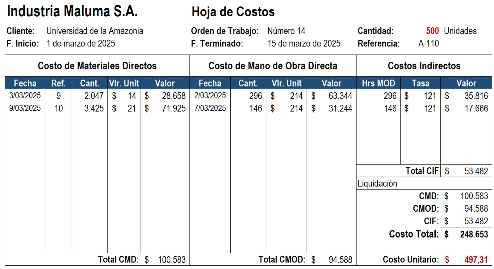 - Cada orden tiene una hoja de costos que registra los elementos del costo: materiales directos, mano de obra directa y costos indirectos.